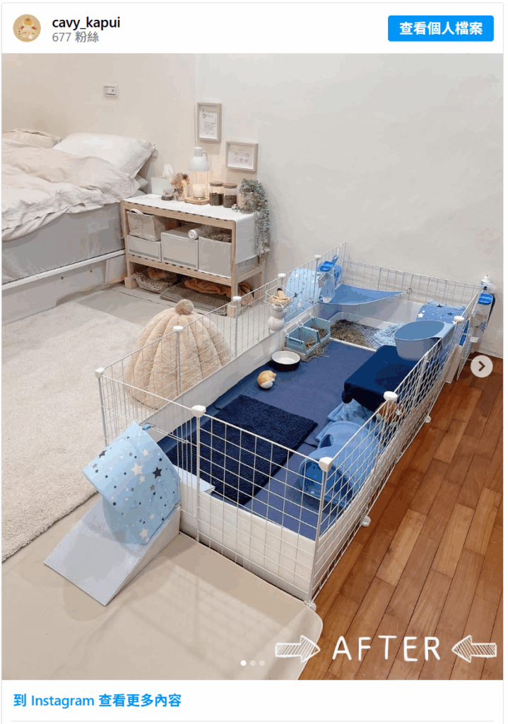 下圖為天友cavy_kapui的豬窩布置;每隻天竺鼠都有不同的個性和需求,除了兼顧安全性,也能依照自己的喜好打造獨一無二的可愛小窩,並持續進化、改造。